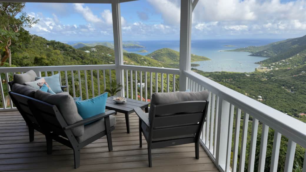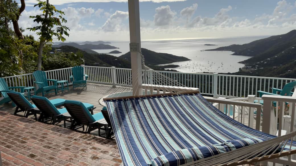 Looking out from the main level porch you will find amazing views overlooking Coral Bay. The exterior staircase takes you upstairs to the primary bedroom, the Salt Pond Suite. This queen en-suite bedroom comes with a daybed and private balcony. There is an iron and board, steamer, and clothing rack in the closet for your use as well. Take the stairs back down to the main level porch to find ample dining and lounge seating ~ perfect for morning coffee or dining al fresco!Â