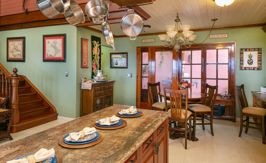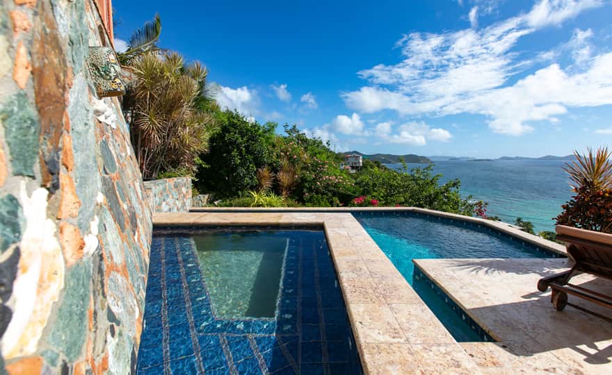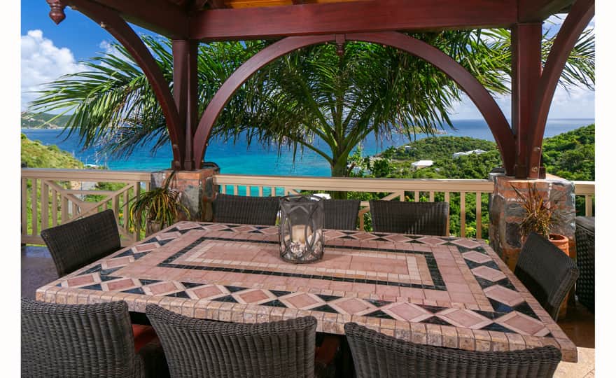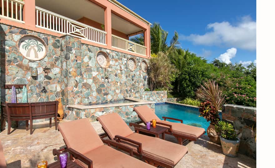 Beautiful, well appointed villa, with three king bedrooms. Each bedroom is very private with it's own separate bath. The two half baths are on the main floor and by the pool terrace. Both kitchens are very well equipped, and each has a wine cooler. There are two grills, one on the main floor patio and one by the pool. Islatesoro is very comfortable with lots of room to relax inside and outside. The large covered porch is cooled by the trade winds, with comfortable seating for reading a good book or watching the sunrise over the islands with a cup of coffee. Unwind on a chaise lounge by the pool, enjoy a swim, and just take in the amazing view. Welcome to your Island Home away from Home!