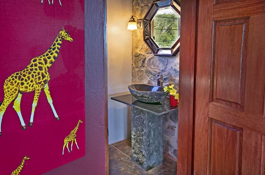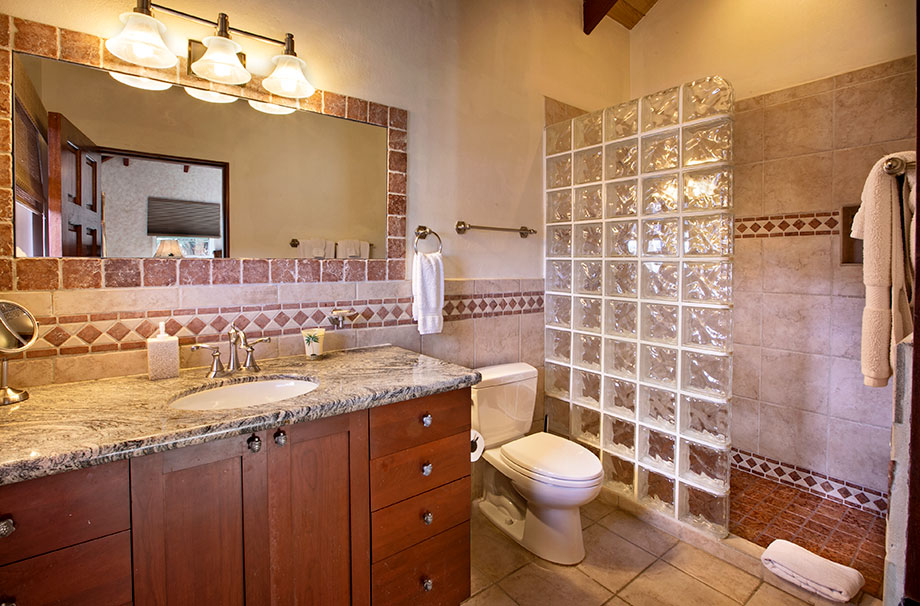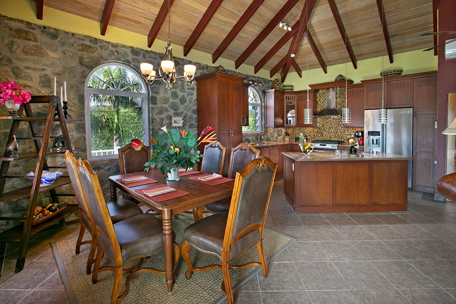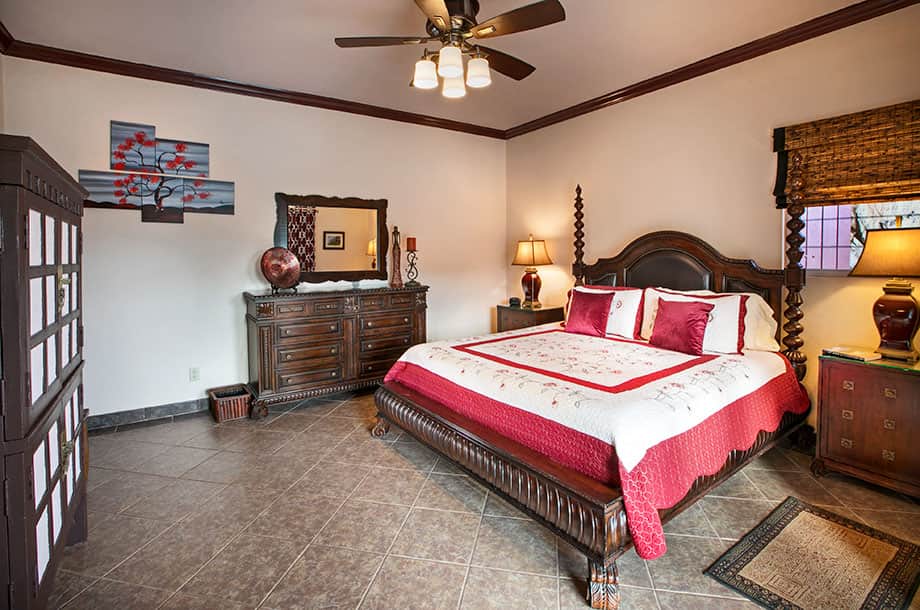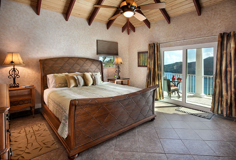 Each of the two master suites have plenty of space and include a king-size bed, en-suite bathroom, a huge walk-in shower with a view, air-conditioning, and a flat screen TV in an armoire. The poolside bedroom suite has a king bed with a leather headboard and an ornately carved bed frame and dresser.