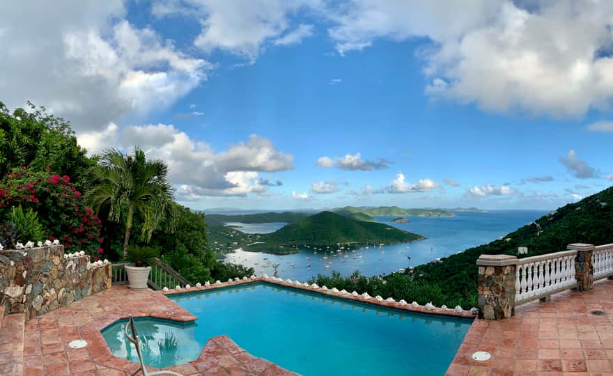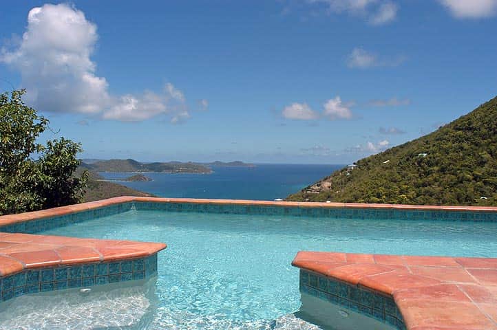 This beautifully appointed Caribbean Style villa, boasts amazing down island views, large pool, lush gardens, gated parking, great breezes, and native stone and artistic tile work. The estate is perched along a ridge facing southeast down island, with very easy access to Coral Bay.