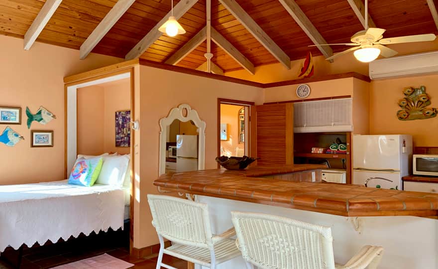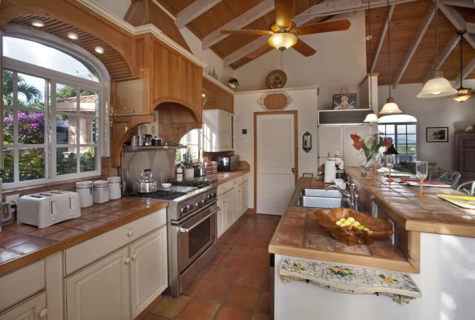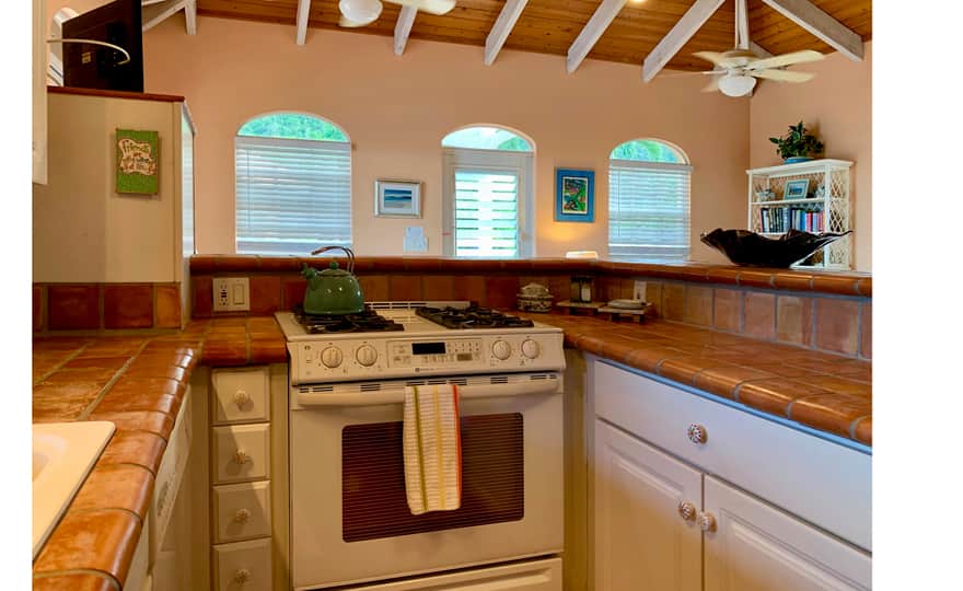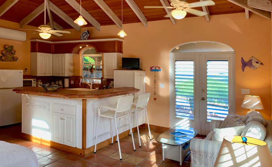 Separated by the pool deck you will find the main house full kitchen and living area with indoor dining table, entertainment system and additional washer/dryer units. Exterior access to the 2nd queen bedroom pod with en suite bath and outdoor shower, separated by an outdoor dining area with great views for dining al fresco. The villa is equipped with a propane generator to keep you comfortable during island outages.