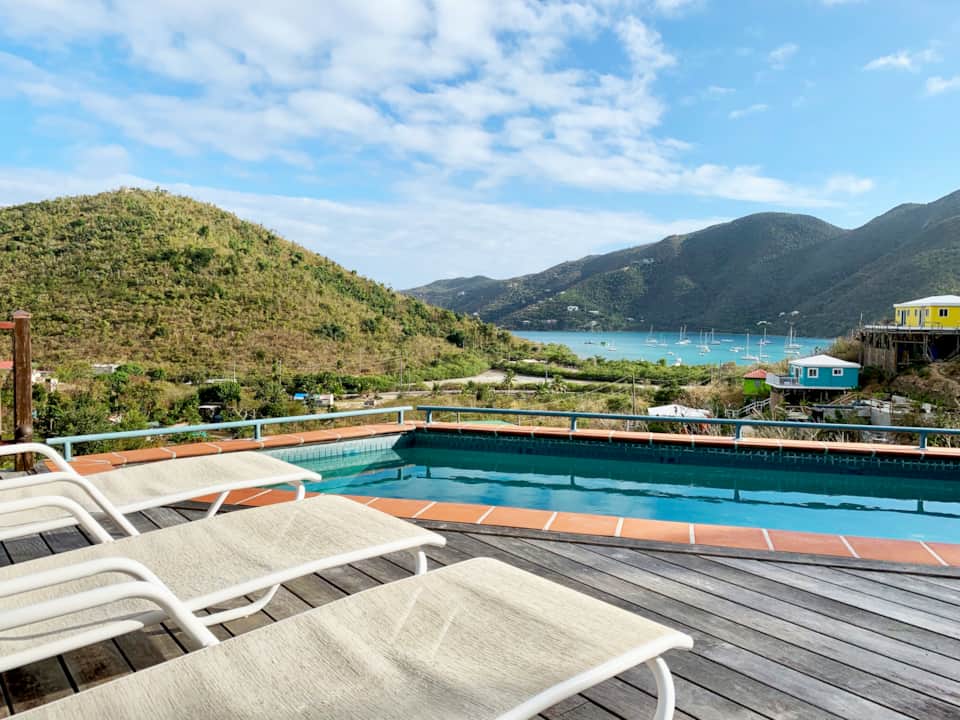 Exterior  staircase takes you to the pool deck and lower-level bedrooms. Private  pool overlooks Coral Bay. On the pool deck you will also find an  outdoor shower with beautiful stonework as well as a bar area with gas  grill for dining al fresco. Descend the steps a little further to reach  the two lower bedrooms. Each bedroom is equipped with queen size beds,  en suite bathrooms and individual AC units. Slider doors off of the  bedrooms lead out onto the lower-level wrap around porch. The villa is perfect for one or two couples!