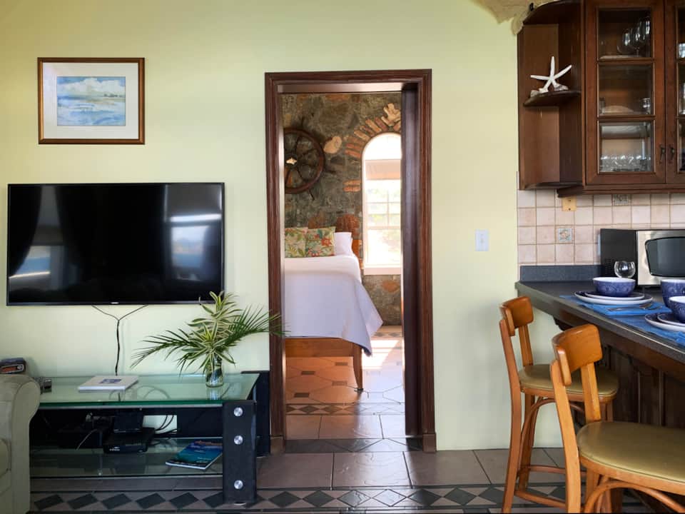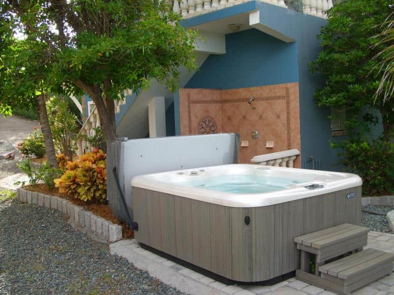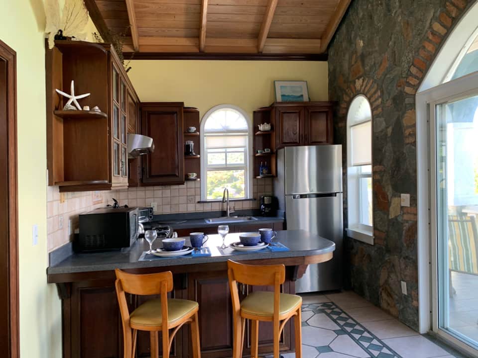 Siempre Azul is a most charming hand crafted villa perfect for honeymooners or anyone wanting relaxation and renewal in an intimate nature filled environment. Siempre sits atop a cliff overlooking the inimitable turquoise Caribbean Sea with incredible mountain and Island views of Tortola and other British Virgin Islands. Amenities include outdoor stone charcoal barbecue, wetbar and dining area, heavenly outdoor shower amidst tropical gardens along with a fabulous hot tub. Inside enjoy the stainless steel kitchen, comfy living area seating, flat screen TV, and central air to further your enjoyment and comfort. Although Siempre Azul is intimately secluded it is conveniently close to the famous St. John beaches, hiking trails, and to Coral Bay's unique shops and dining spots. Enjoy your morning beverage sitting on the newly tiled balcony; perhaps catching the sailboats shimmering across the sea, or sun on the lounge chairs perched on the cliff. Listening to the sounds of the sea or observing the magnificent early morning sunrise are both meditative and inspiring. For our more adventurous guests follow the steps below the villa for a walk on the coral beach below meandering on the trail to St John's famous Miss Lucy's restaurant and a very local sandy beach. Speaking of beaches you are surely to find your very favorite among the many 'jewels' on St John- from the famous Trunk Bay to the much lesser known coves on the East End of the Island. Siempre is located directly off a paved road with paved driveway and parking right up to the villa!