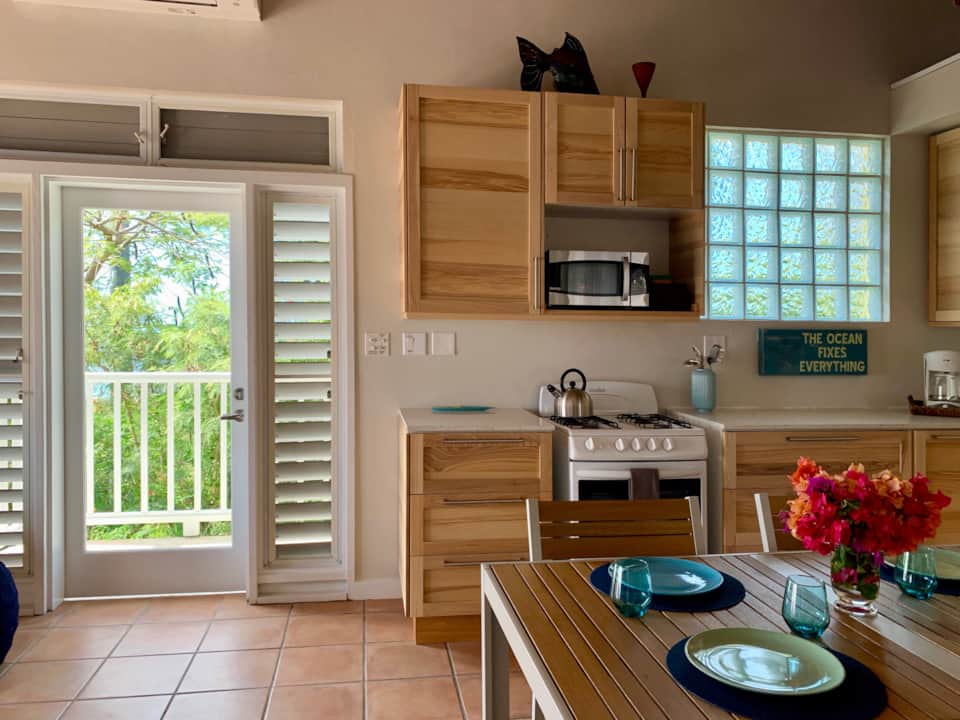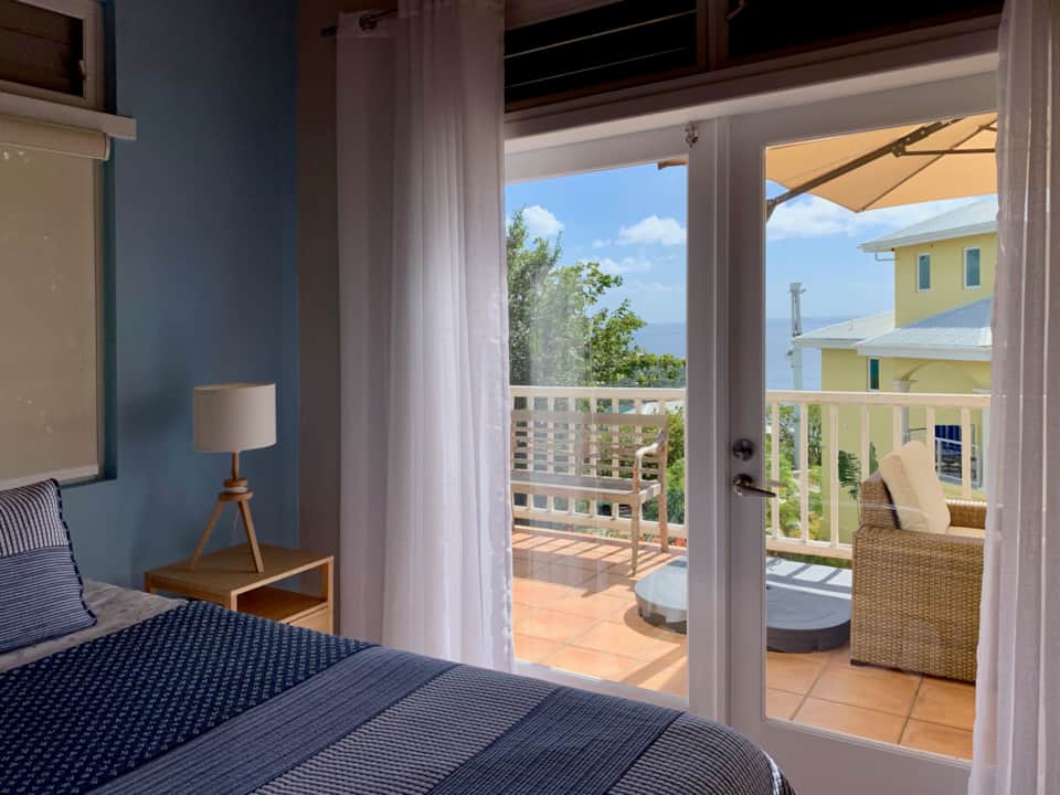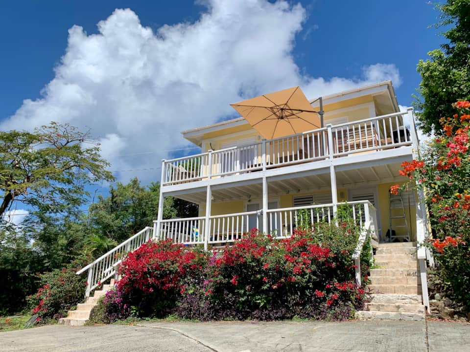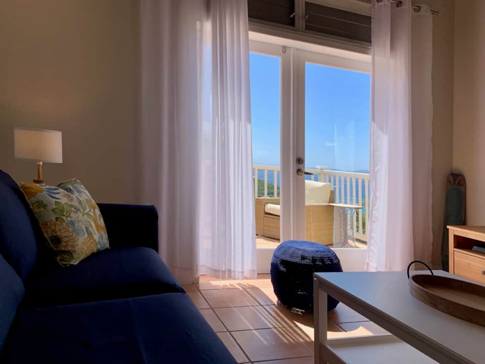 Enjoy panoramic ocean and sunset views from the hilltop terrace of this comfortable villa, located on the west side of St. John, minutes from crystal clear beaches, the Virgin Islands National Park, car and people ferries and downtown Cruz Bay. This 2 bedroom, 2 bathroom standalone villa provides casual island comforts for a family of four. It’s the perfect place to come back to and relax after a fun day of snorkeling in the blue waters of St. John’s pristine beaches. A few steps down the hill you can also enjoy a fresh water splash in the common area pool. It’s a place where you can prepare a homemade BBQ in the gas grill while enjoying the sunset, or head down to Cruz Bay and enjoy an outstanding meal from one of the many delicious restaurants.